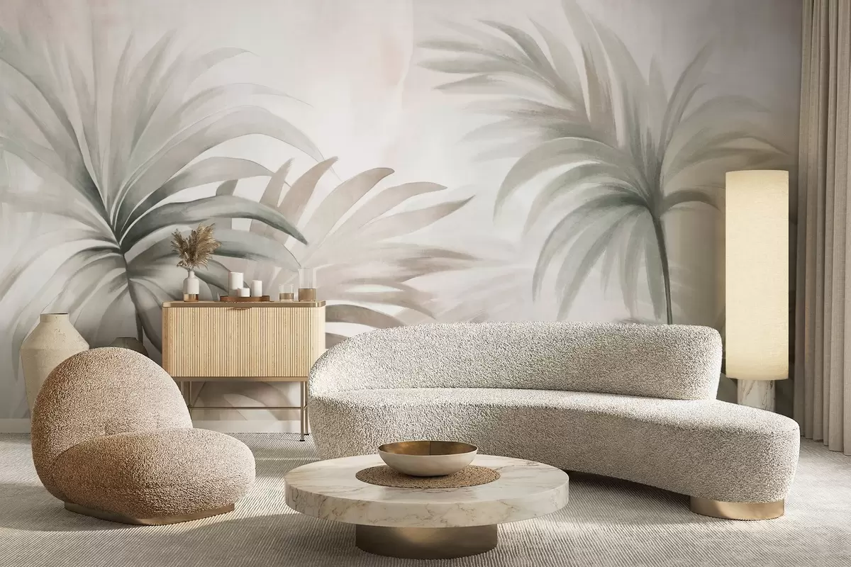 Fotobehang Palmboom getextureerde bladeren in neutrale kleuren, beige abstracte achtergrond, zachte penseelstreken, tropisch getextureerd gebladerte N° w09380