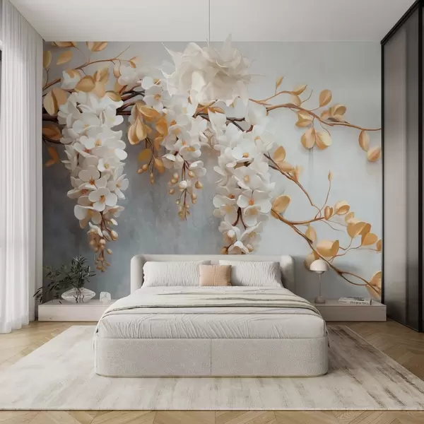 Fotobehang Witte blauwe regen bloemen met gele bladeren op een tak, trapsgewijs naar beneden tegen een textuur witte achtergrond, delicate bloemblaadjes N° w09381