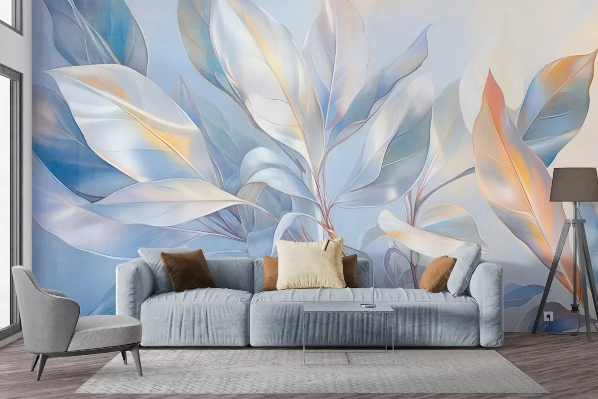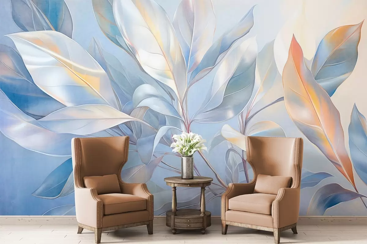Fotobehang Magnoliabladeren met witte en blauwe tinten, zachte verlichting, elegante compositie, gedetailleerde bladnerven, artistieke penseelstreken N° w09385