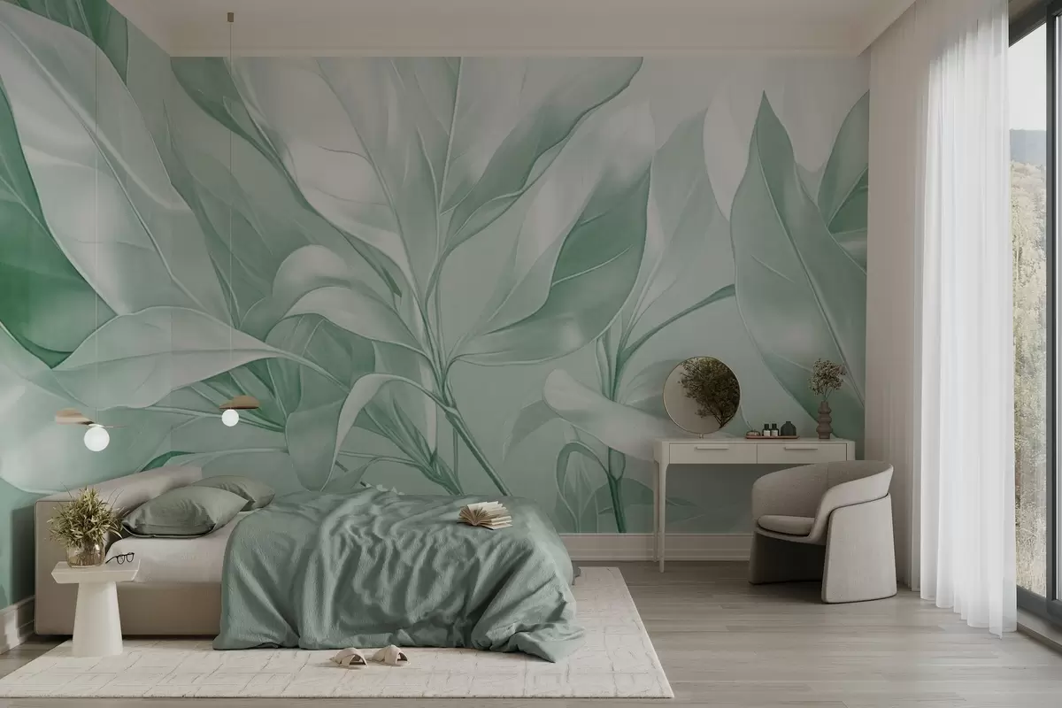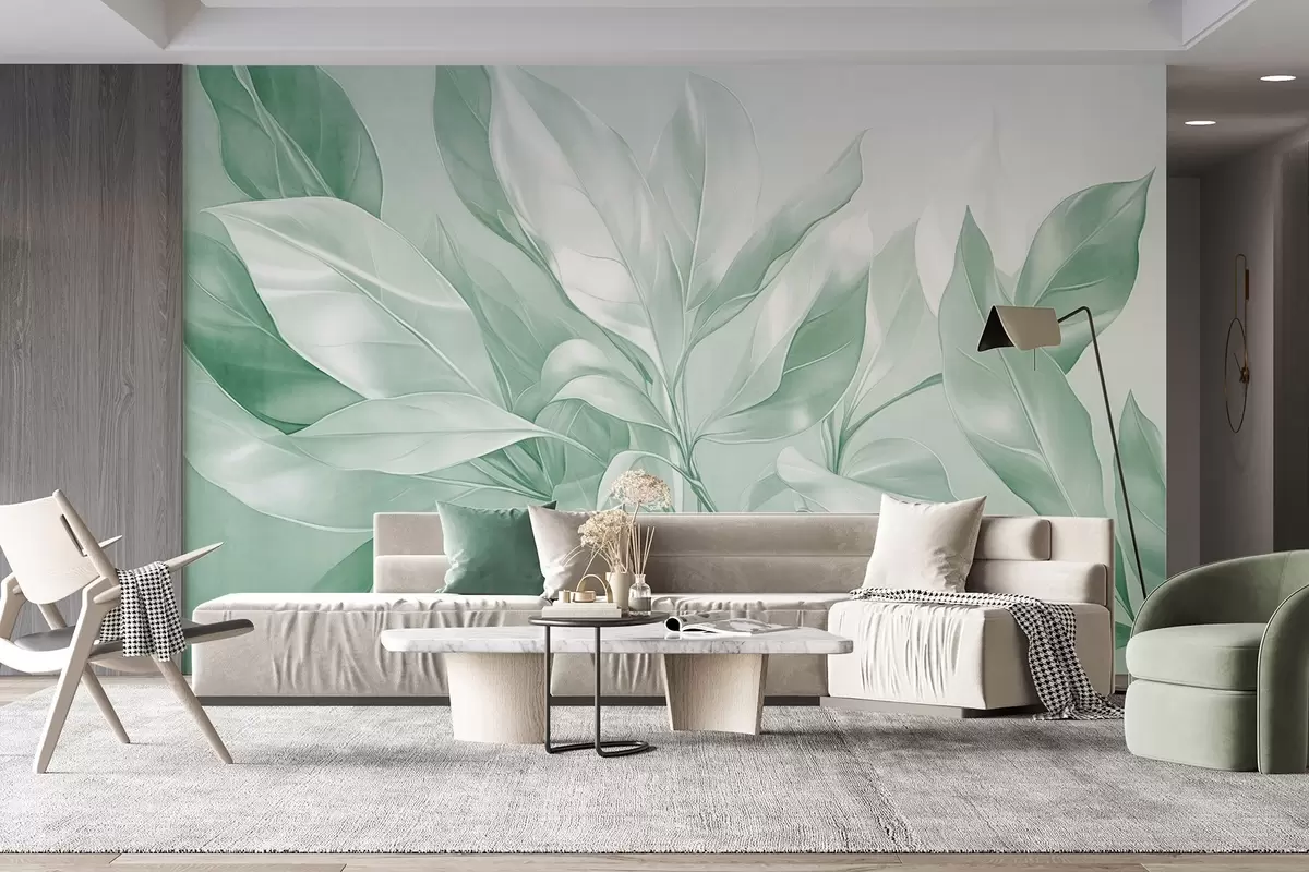 Fotobehang Magnoliabladeren met witte en groene tinten, zachte verlichting, elegante compositie, gedetailleerde bladnerven, artistieke penseelstreken N° w09385v1