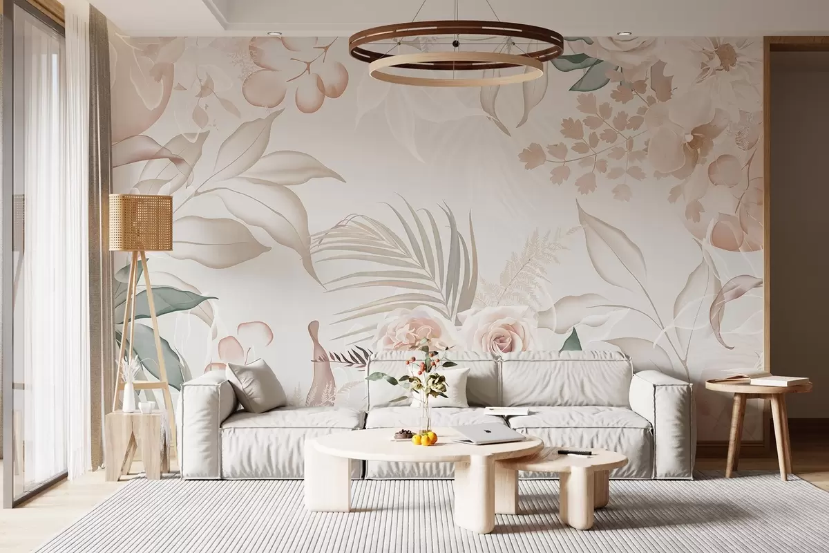 Fotobehang Bloemstuk met textuur, bestaande uit rozen, orchideeën, eucalyptus en palmbladeren in pastelkleuren, op een beige achtergrond N° w09393