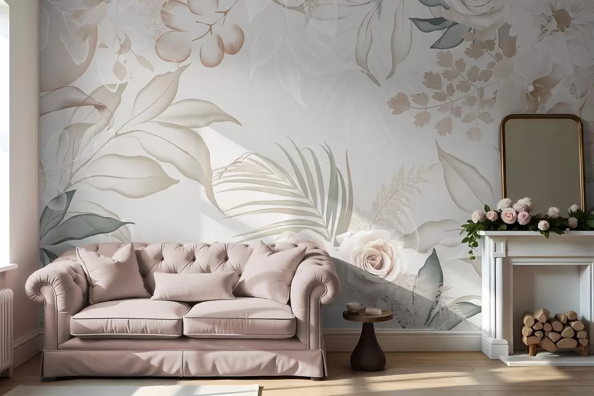 Fotobehang Bloemstuk met textuur, bestaande uit rozen, orchideeën, eucalyptus en palmbladeren in pastelkleuren, op een beige achtergrond N° w09393