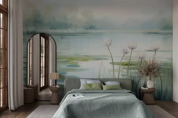Fotobehang Landschap met een meer, waterlelies en leliebladeren, bomen op de achtergrond, in een rustige omgeving, lichtblauwe en groene tinten N° w09395