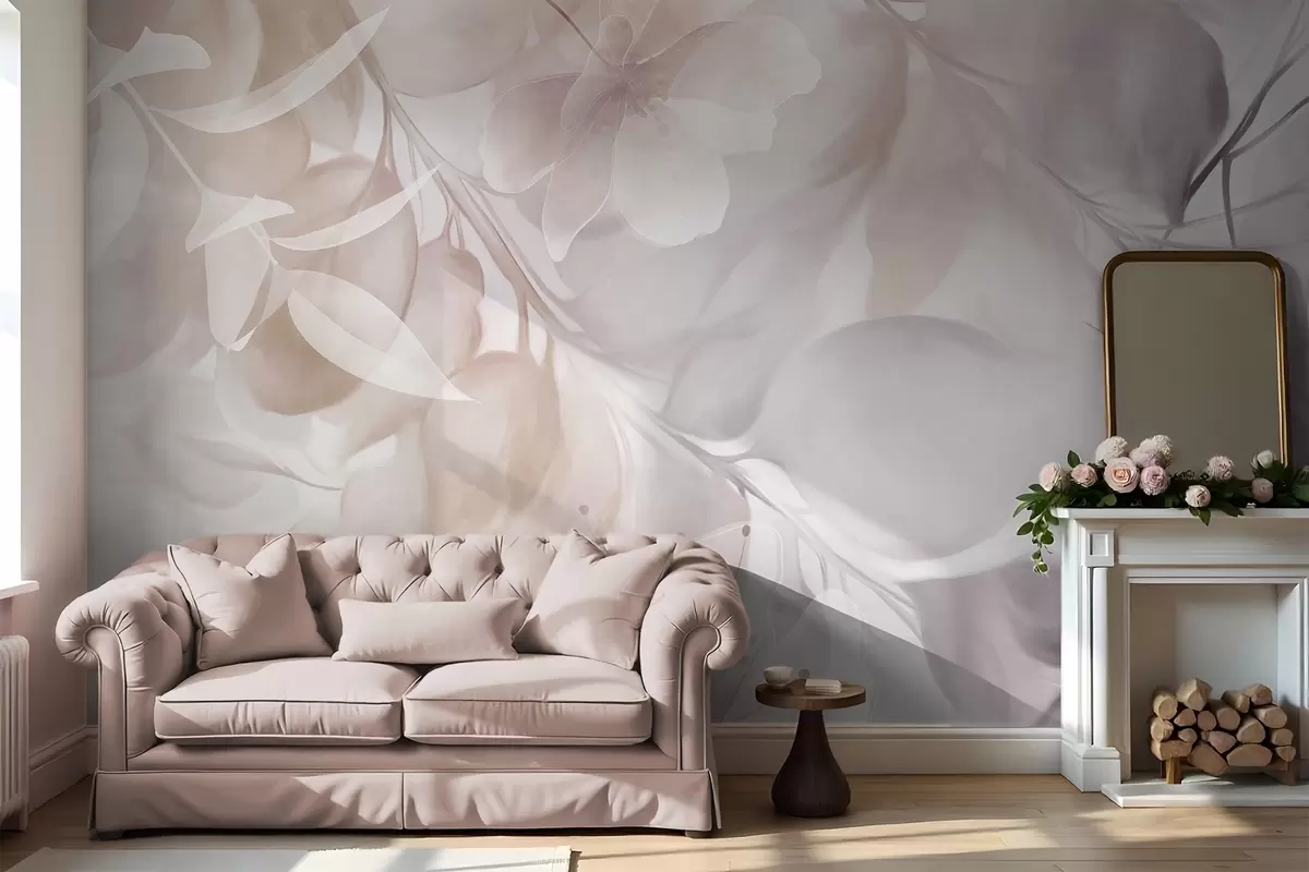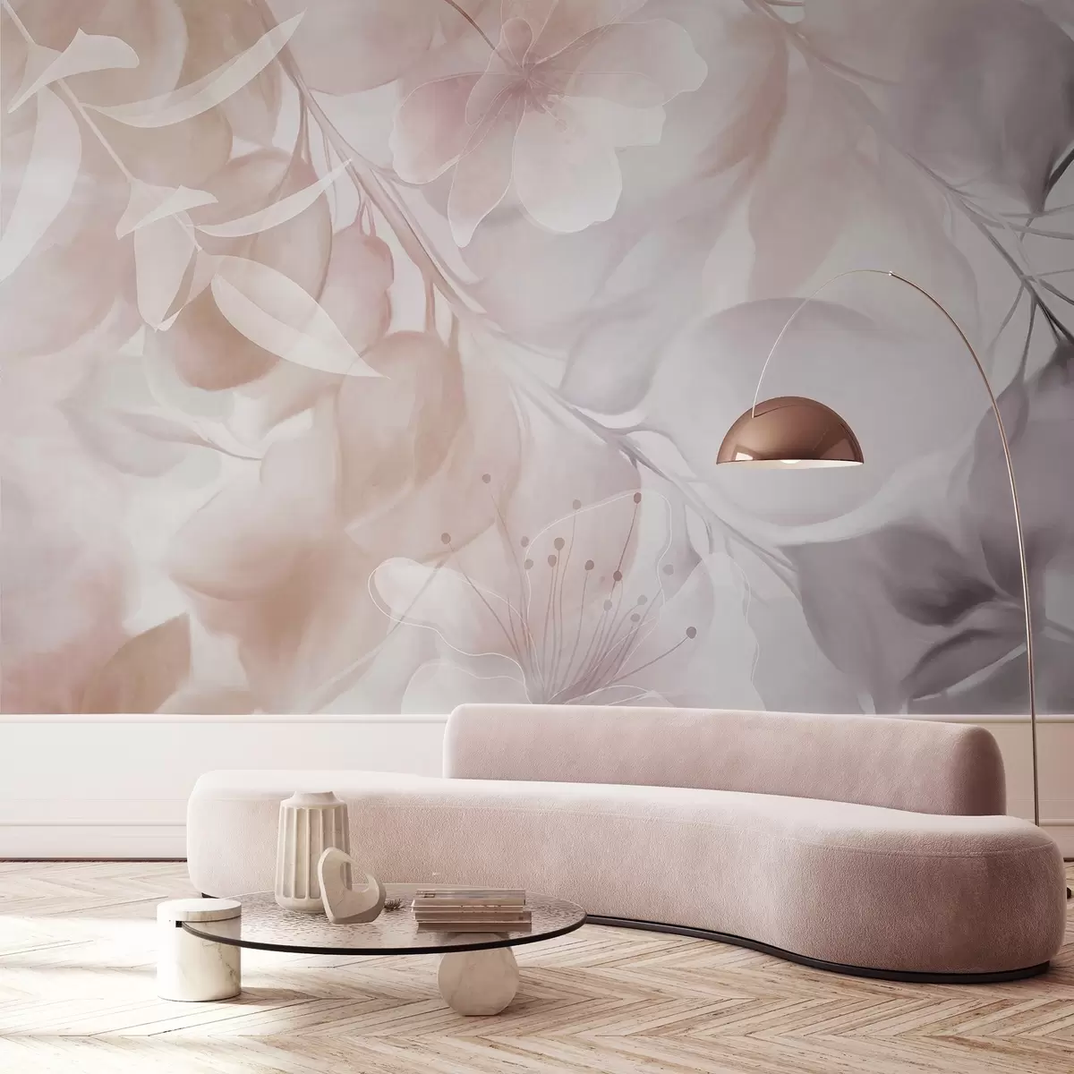 Fotobehang Bloemenkunst met gedempte beige en bruine bloemen, bladeren en takken, zachte pastelkleuren, aquarelstructuureffect N° w09397