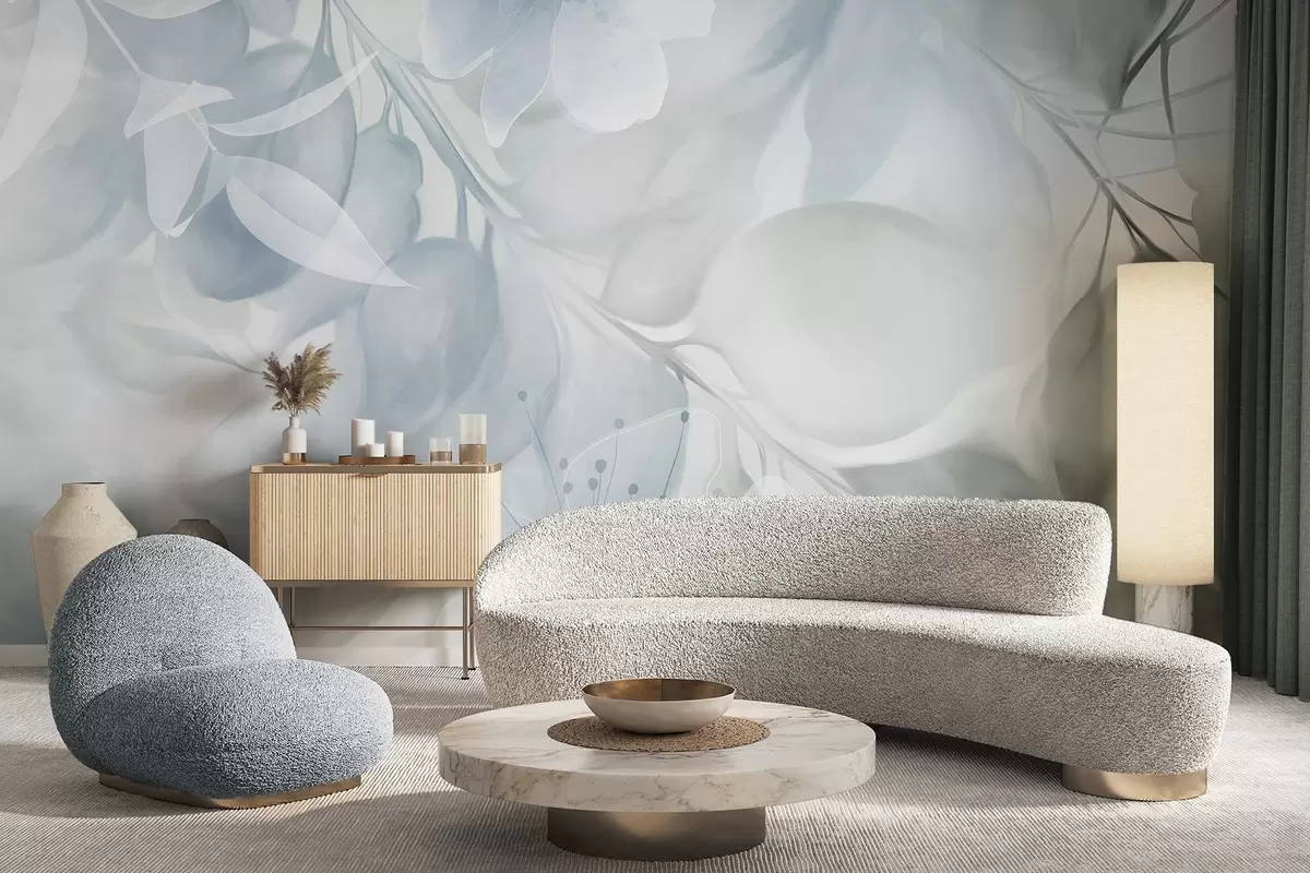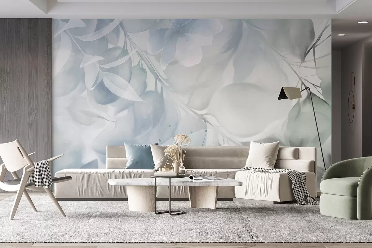 Fotobehang Bloemenkunst met gedempte blauwe en groene bloemen, bladeren en takken, zachte pastelkleuren, aquarelstructuureffect N° w09397v1