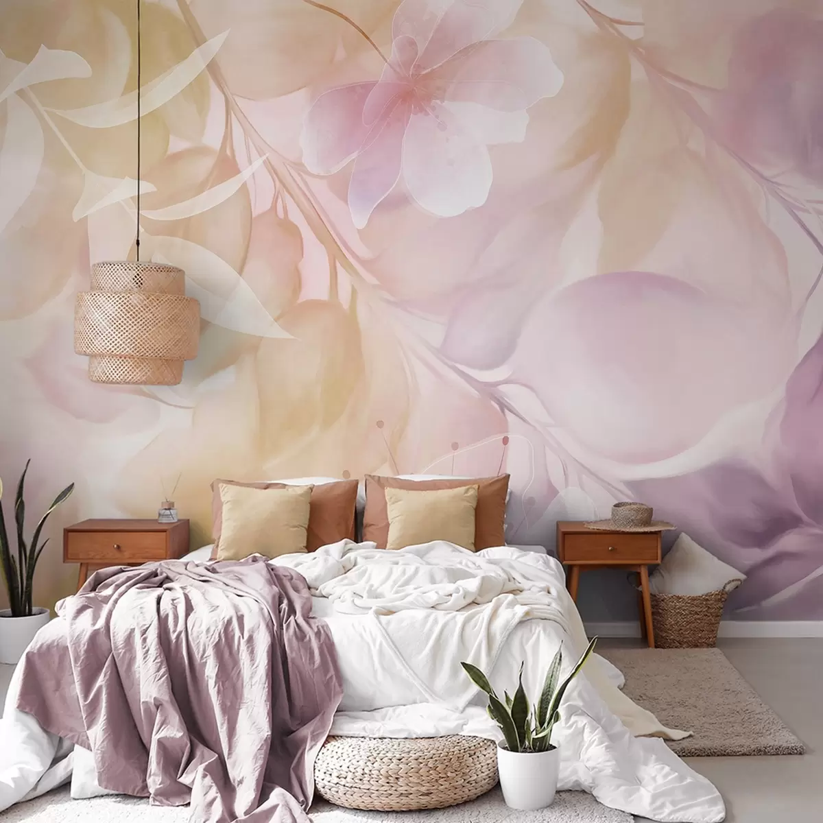 Fotobehang Bloemenkunst met gedempte gele en paarse bloemen, bladeren en takken, zachte pastelkleuren, aquareltextuureffect N° w09397v2