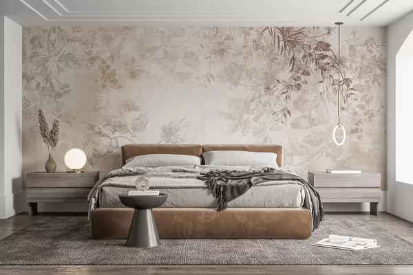 Fotobehang Vintage bloemenkunst met textuur, met illustraties van delicate tuinbloemen en bladeren in tekenstijl, in zachte pastelbeige en sepia tinten N° w09402