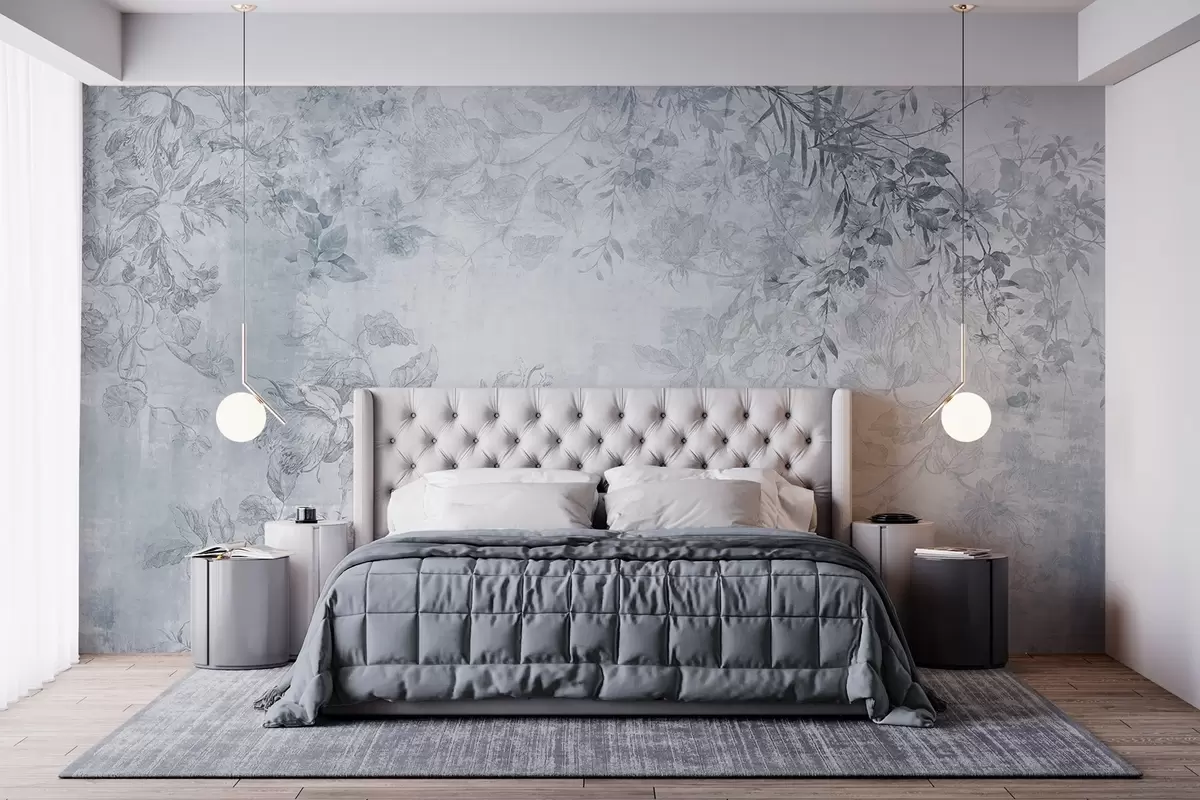Fotobehang Vintage bloemenkunst met textuur, met illustraties van delicate tuinbloemen en bladeren in tekenstijl, zachte blauwe tinten N° w09402v1