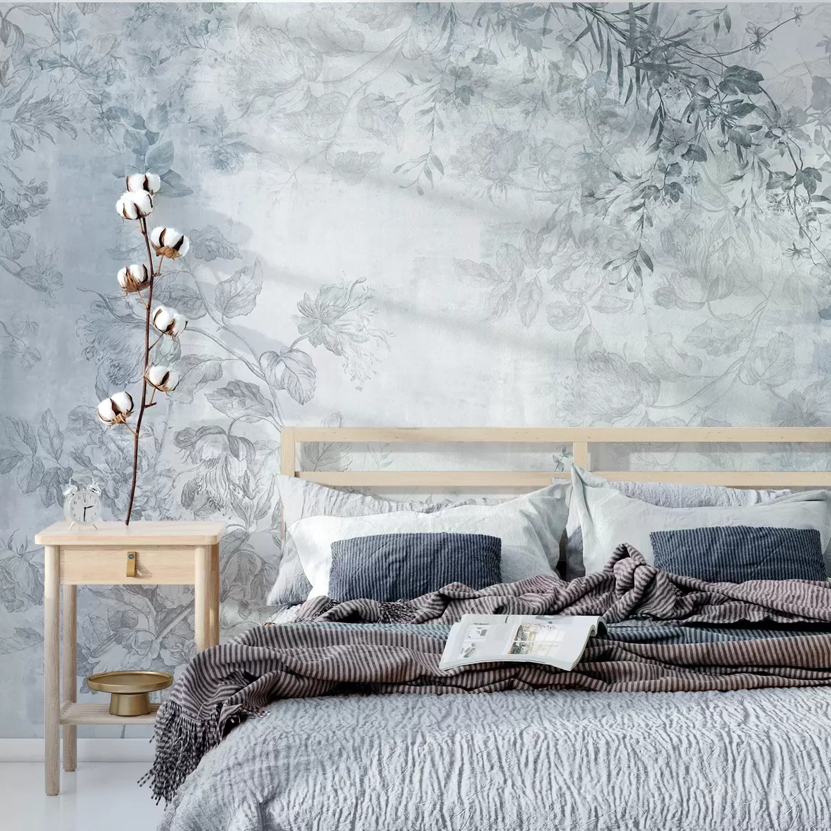 Fotobehang Vintage bloemenkunst met textuur, met illustraties van delicate tuinbloemen en bladeren in tekenstijl, zachte blauwe tinten N° w09402v1