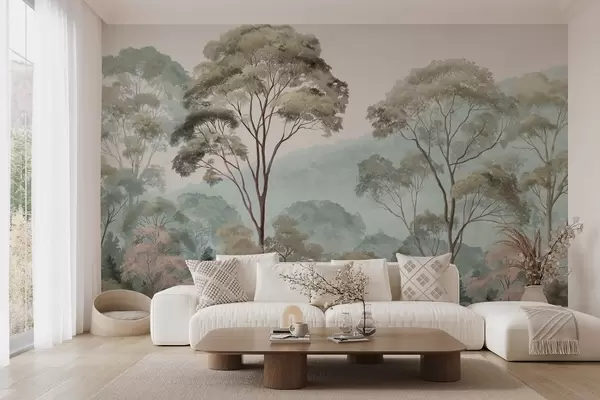 Fotobehang Mistige ochtend in het bos in aquarelstijl N° w09405