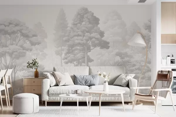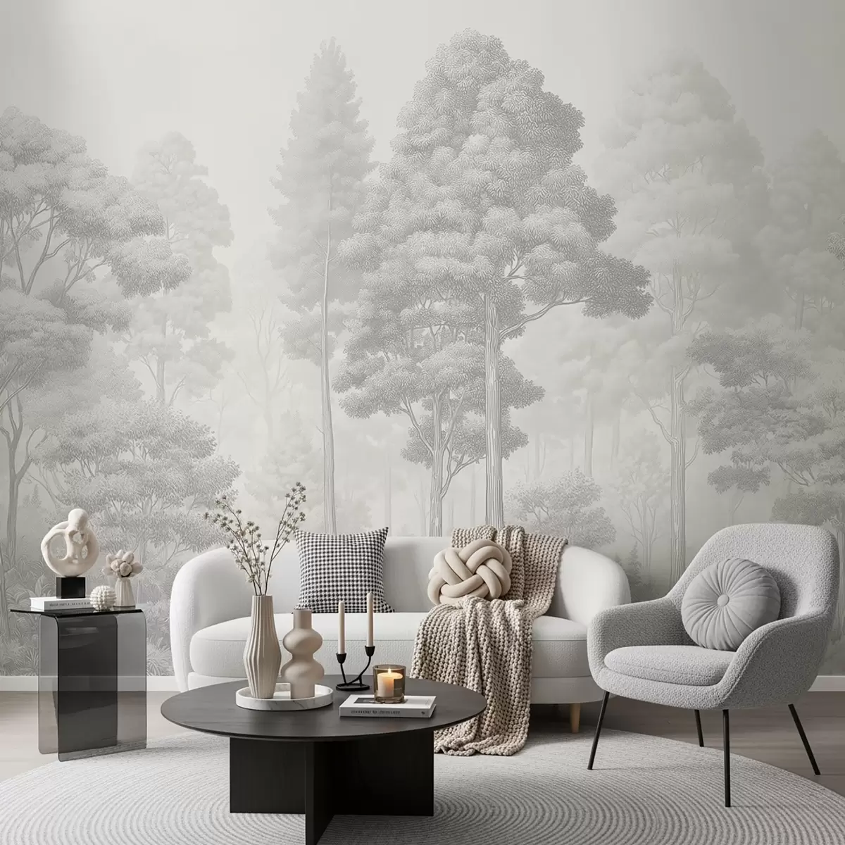Fotobehang Artistiek boslandschap in de techniek van zwart-wit grafische arcering N° w09411