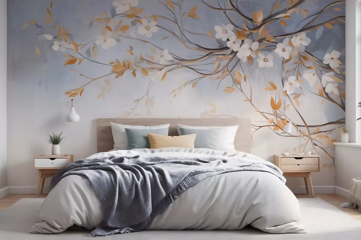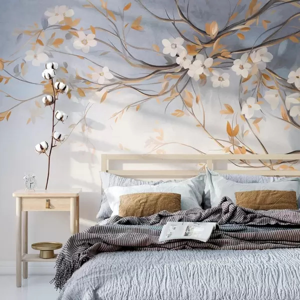 Fotobehang Witte bloemen met oranje bladeren op een boomtak, lichtblauwe achtergrond met textuur, delicate penseelstreken N° w09415