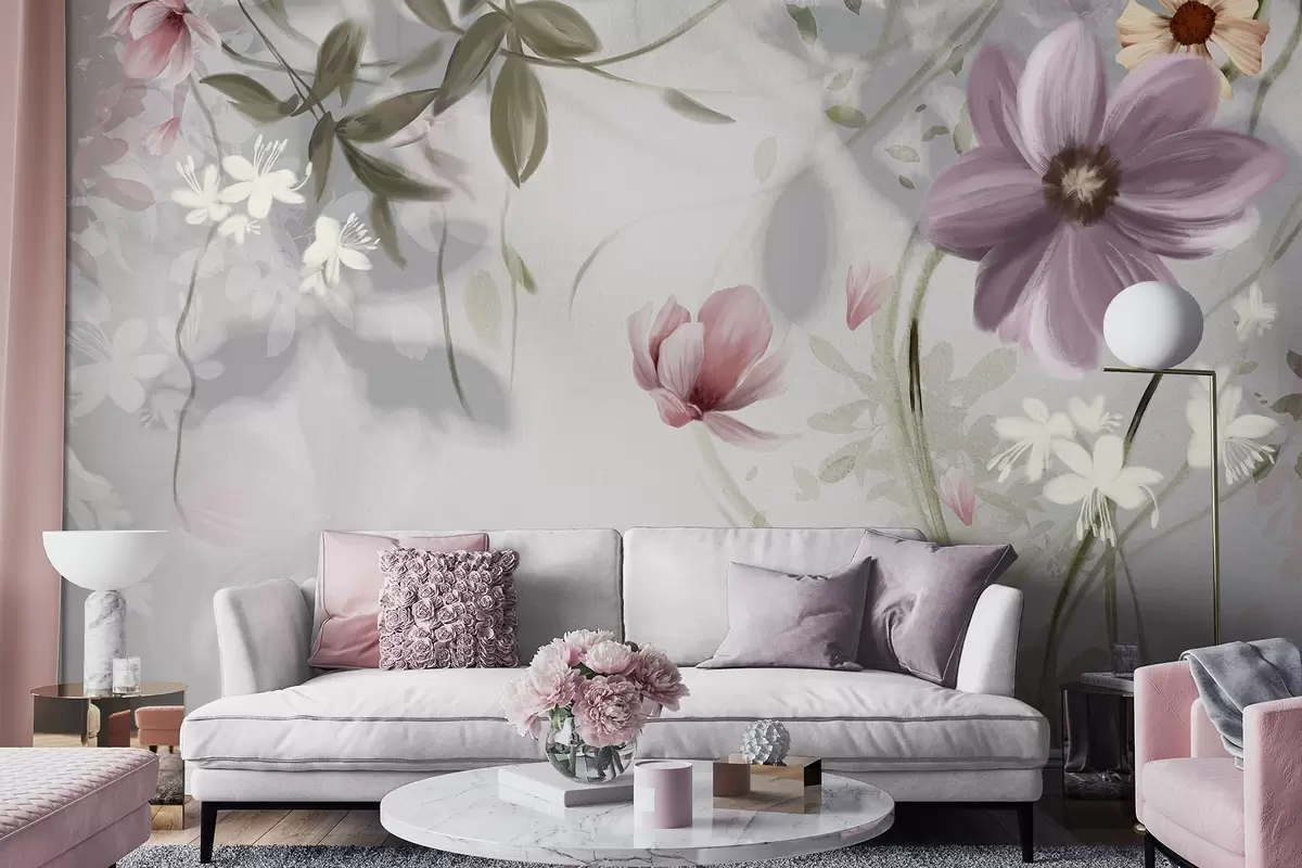 Fotobehang Roze en witte bloemen met groene stelen en bladeren, zachte verlichting, gedempte kleuren, bloemstuk N° w09417v1