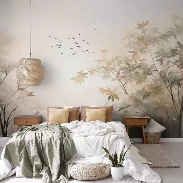 Fotobehang Landschap met textuur, bomen en een zwerm vogels die door de lucht vliegen, pastelkleuren, natuurtafereel N° w09418