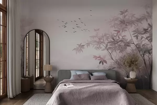 Fotobehang Landschap met textuur, bomen en een zwerm vogels die door de lucht vliegen, pastelkleuren, natuurtafereel N° w09418v1
