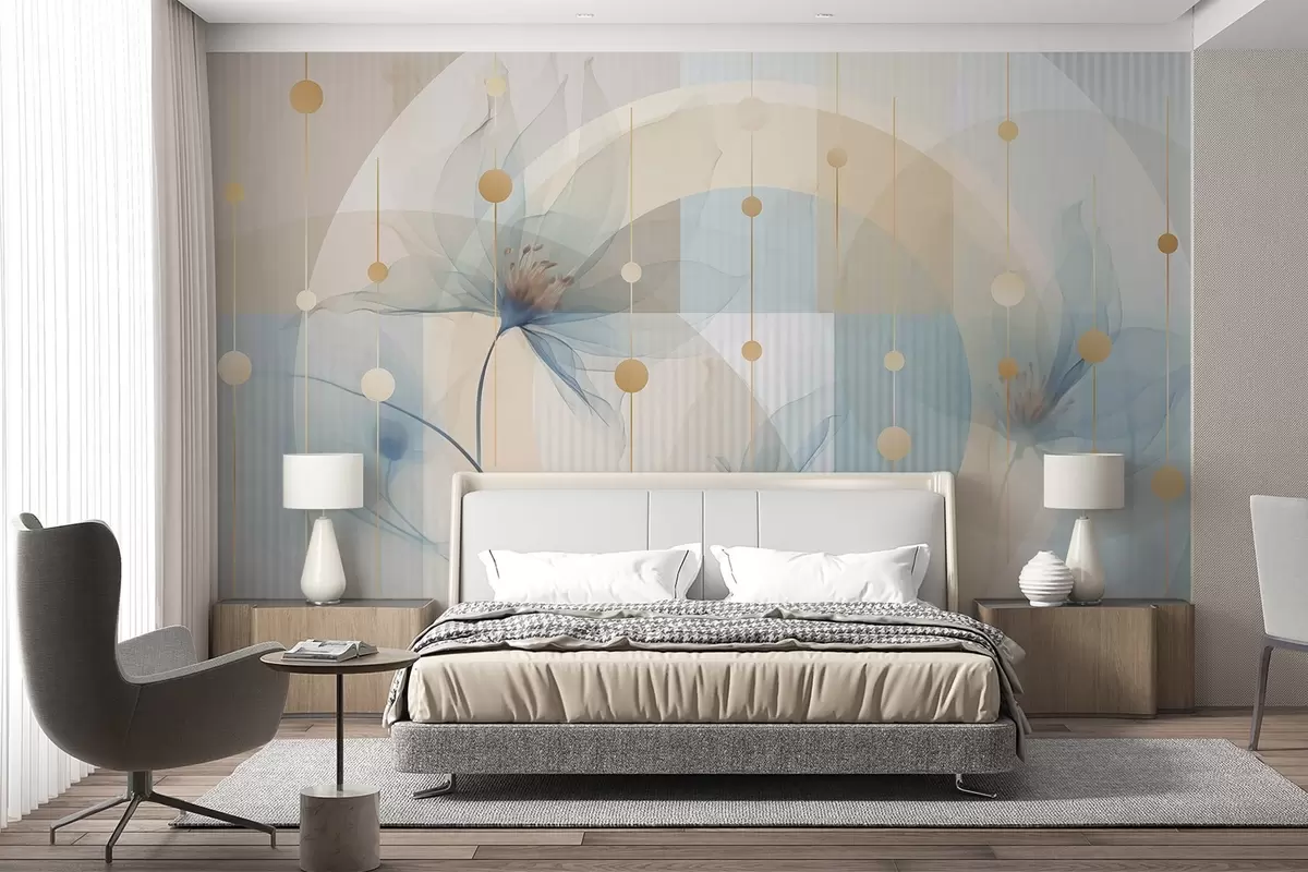 Fotobehang Abstracte doorschijnende bloemen, cirkels en geometrische vormen, pastelblauw, beige en wit kleurenpalet N° w09419