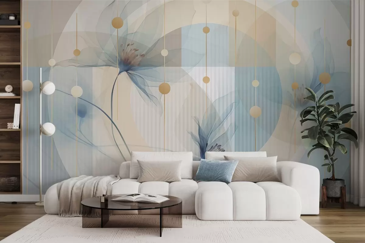 Fotobehang Abstracte doorschijnende bloemen, cirkels en geometrische vormen, pastelblauw, beige en wit kleurenpalet N° w09419