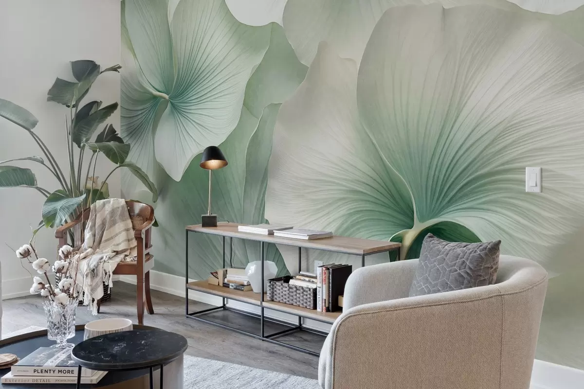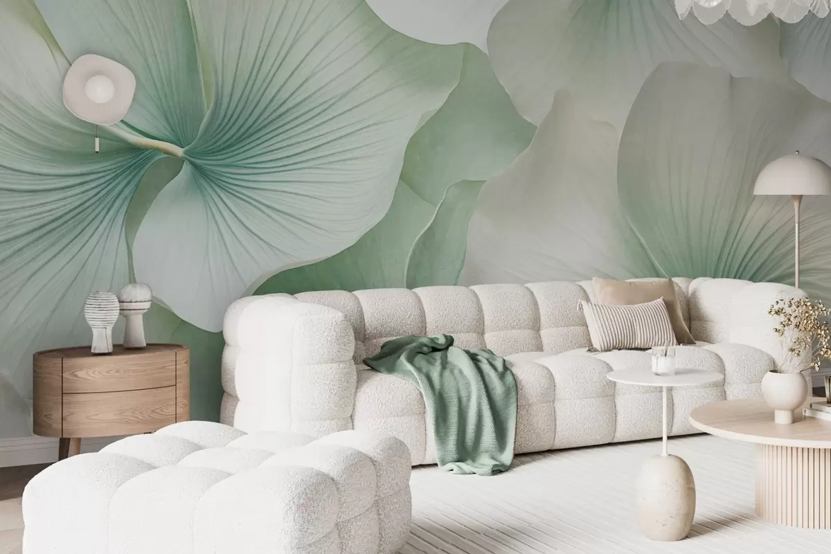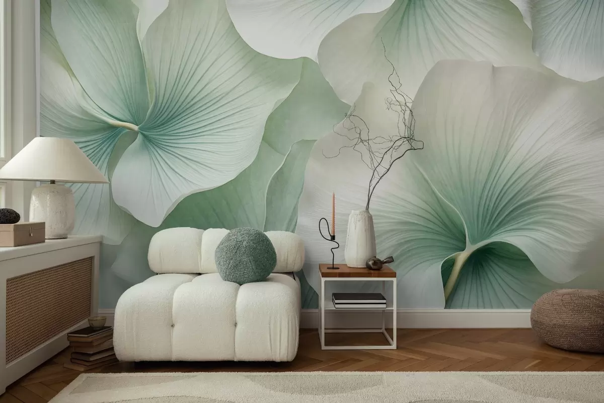 Fotobehang Witte en groene ginkgobladeren, zachte textuur, abstracte bloemenachtergrond, minimalistische moderne stijl N° w09421