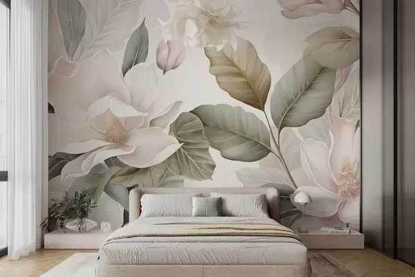 Fotobehang Magnoliabloemen met bladeren in pastelkleuren, wit, roze en groen, zacht, delicaat, aquarelstijl N° w09427