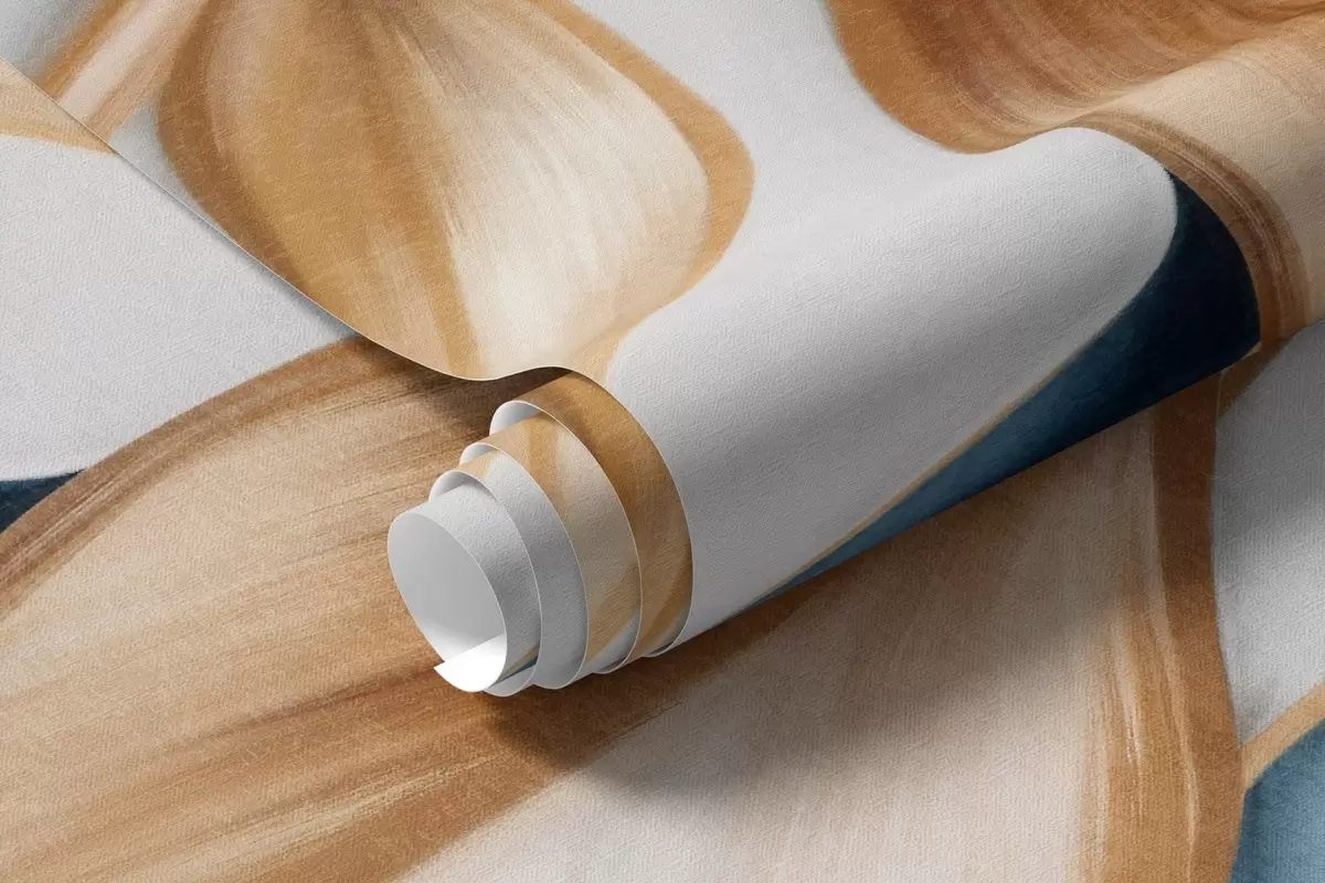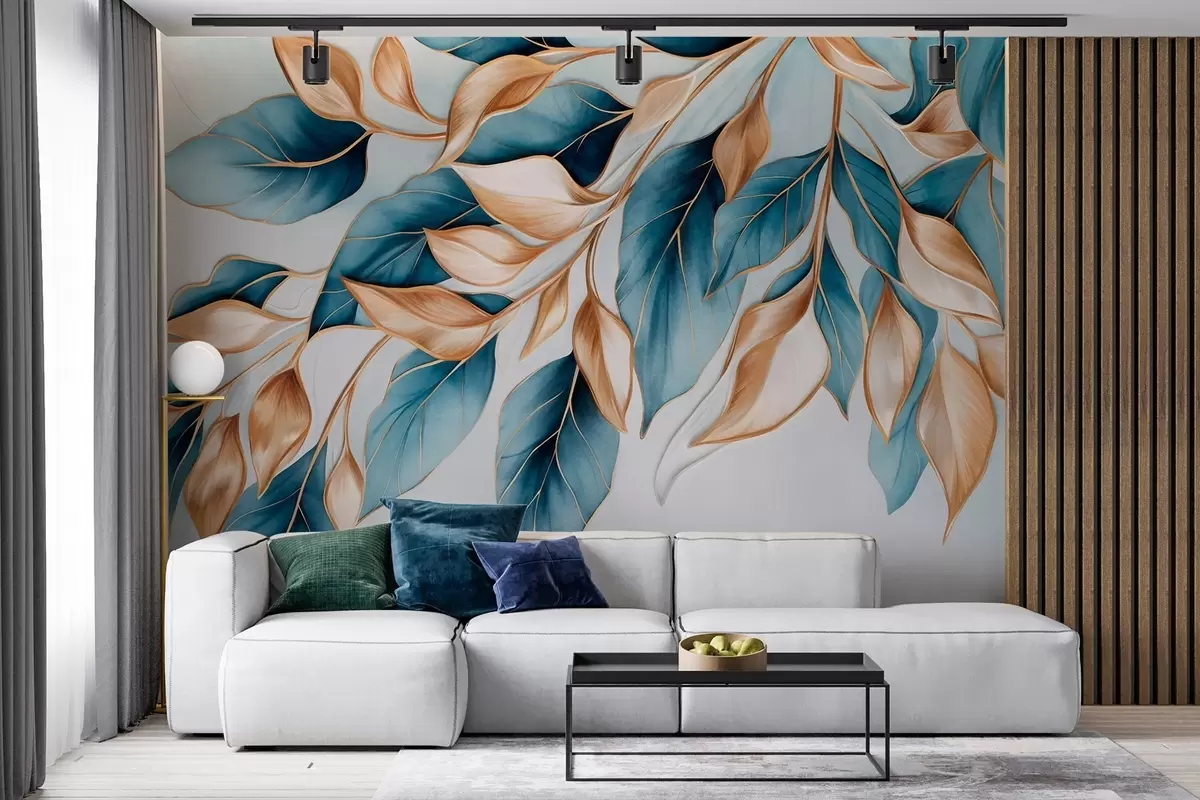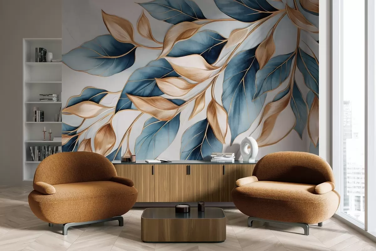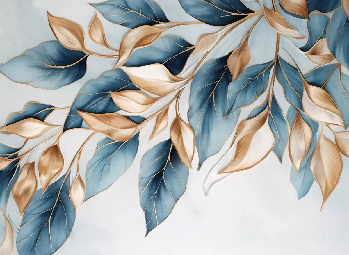 Fotobehang Getextureerde blauwe en oranje bladeren, lichtblauwe achtergrond, elegant en artistiek ontwerp, moderne stijl N° w09429