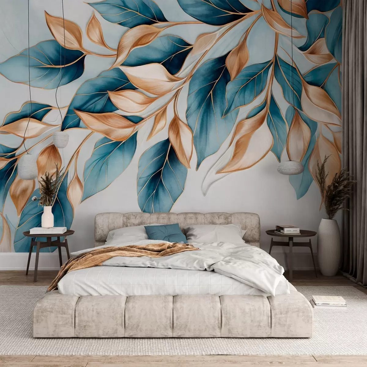 Fotobehang Getextureerde blauwe en oranje bladeren, lichtblauwe achtergrond, elegant en artistiek ontwerp, moderne stijl N° w09429