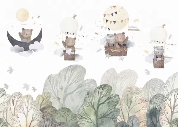 Fotobehang Ballonnen in aquarelstijl met beren boven het bos N° w09437