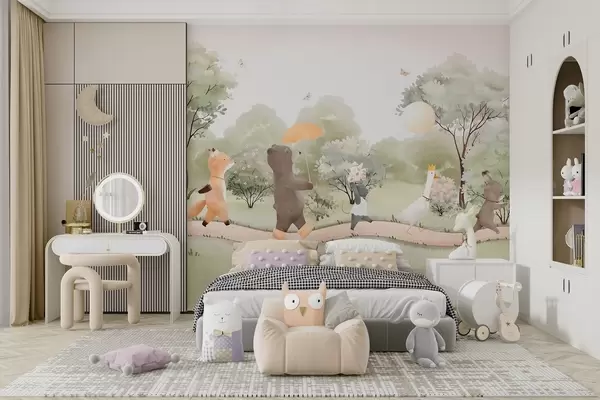 Fotobehang Feestelijke reis van kleine dieren door het bos in aquarelstijl N° w09440