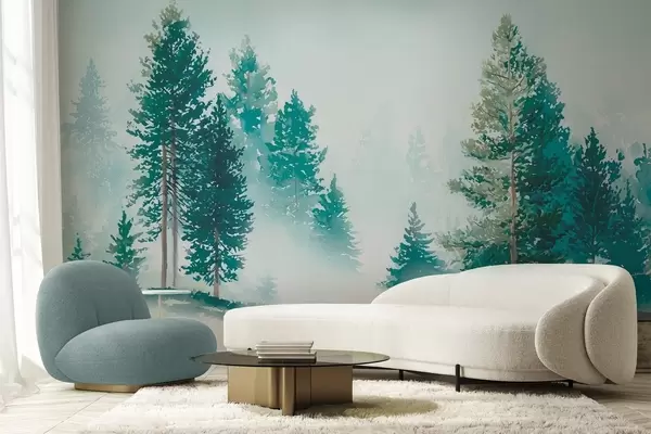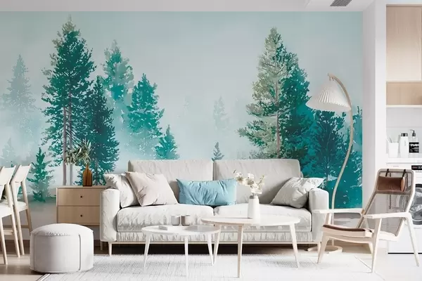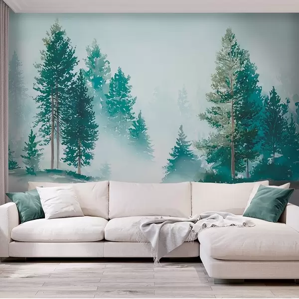 Fotobehang Mistig dennenbos in aquarelstijl N° w09444