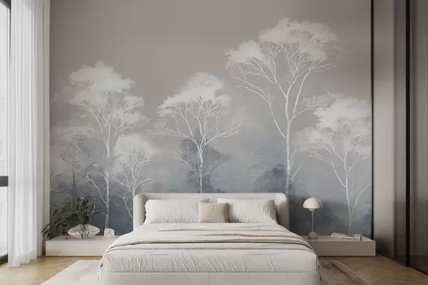 Fotobehang Minimalistische bomen in blauwgrijs palet, in mist N° w09448