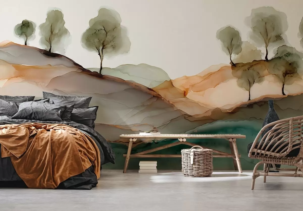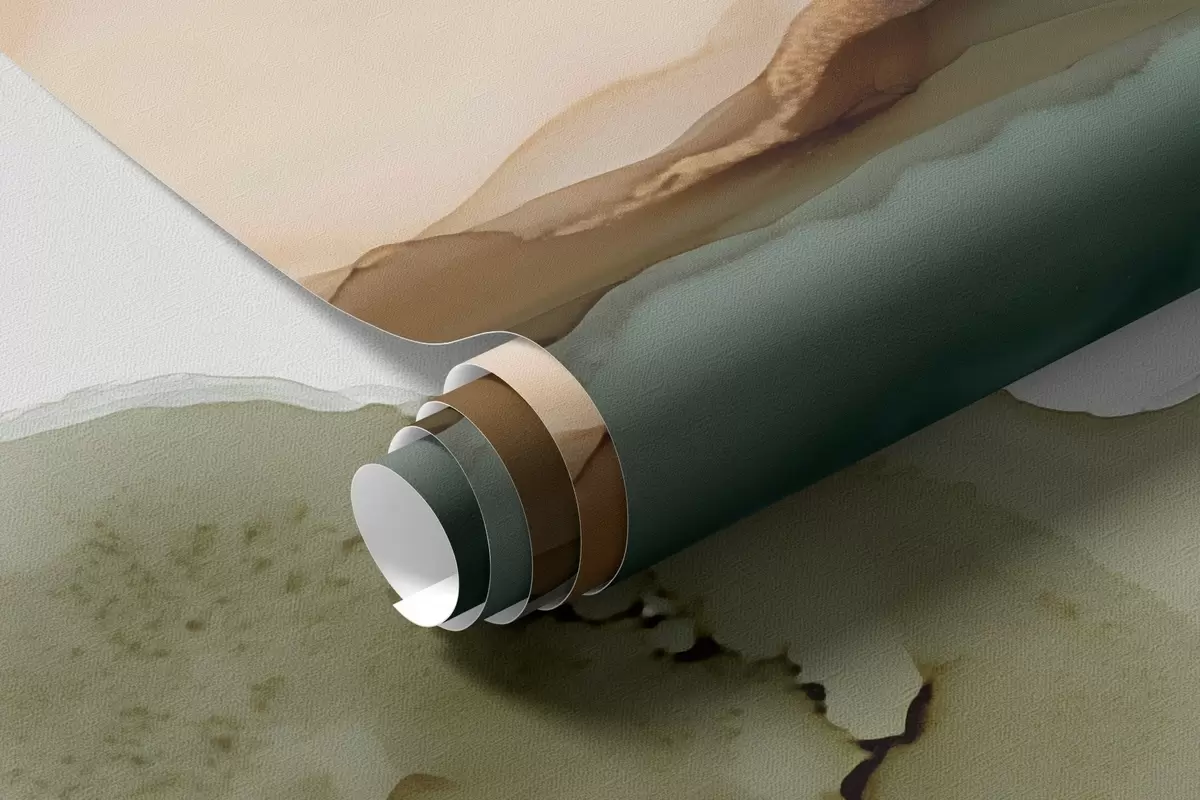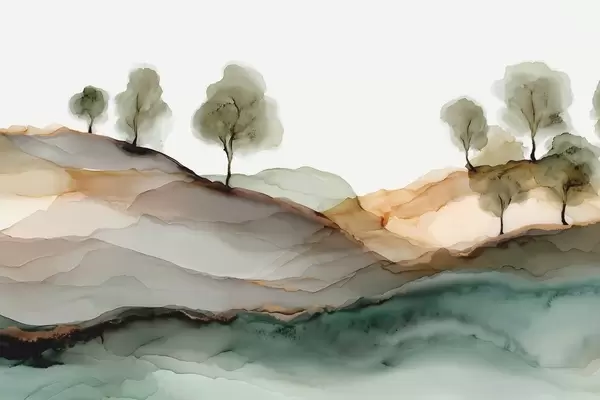 Fotobehang Abstract landschap in alcoholinktstijl — heuvels en bomen in pasteltinten N° w09457