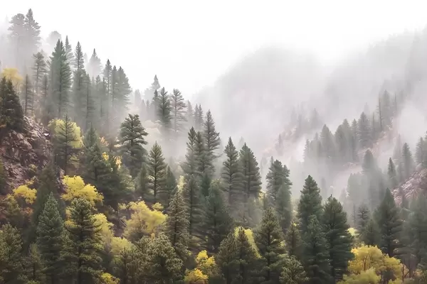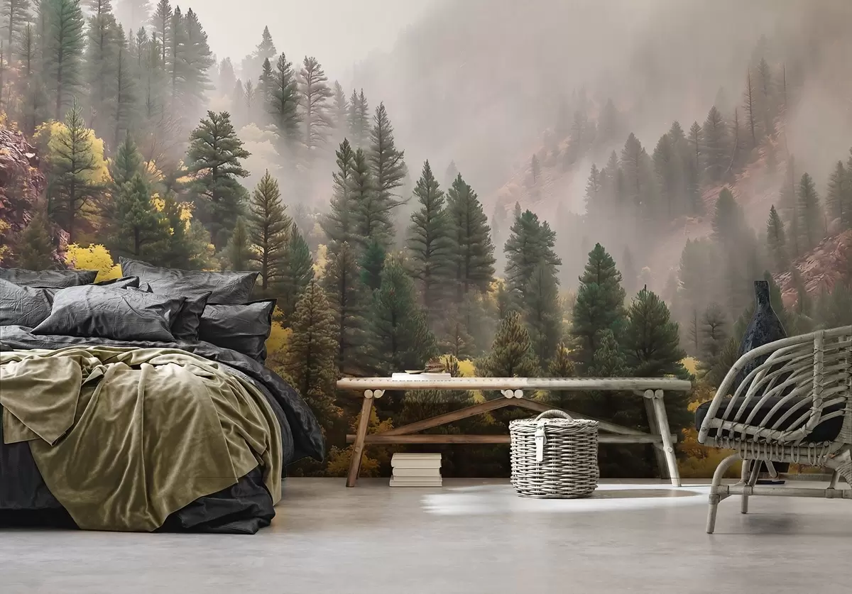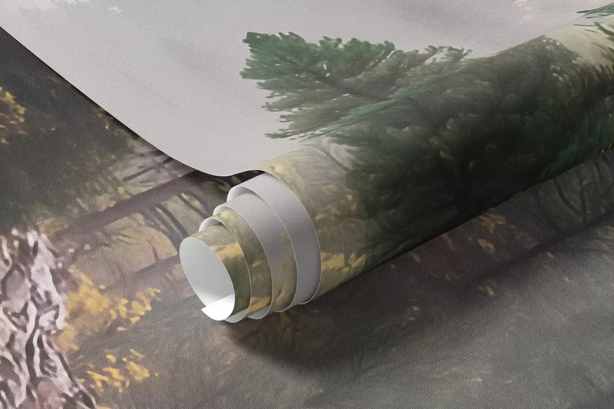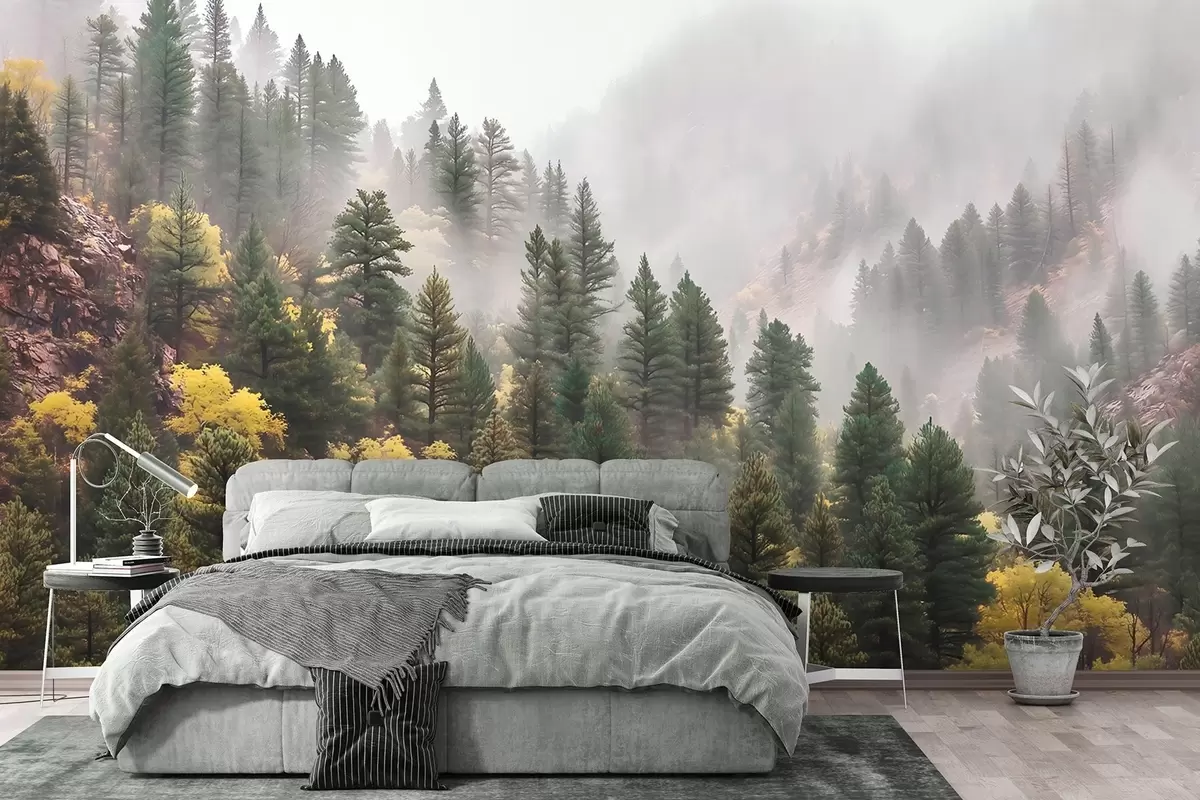 Fotobehang Sfeervol mistig dennenbos in de bergen N° w09463