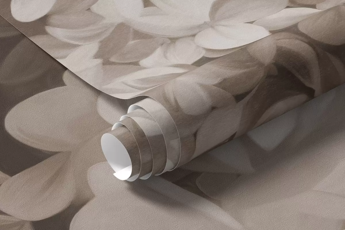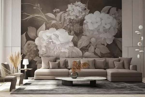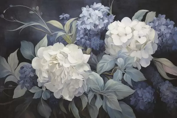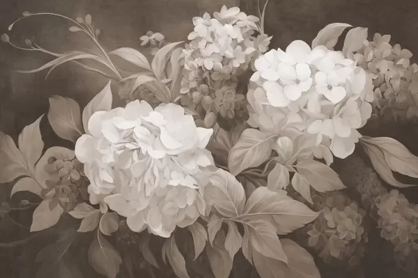 Fotobehang Getextureerde sepia-schilderijimitatie van hortensiabloemen met grote bladeren, abstracte en donkere achtergrond N° w09465