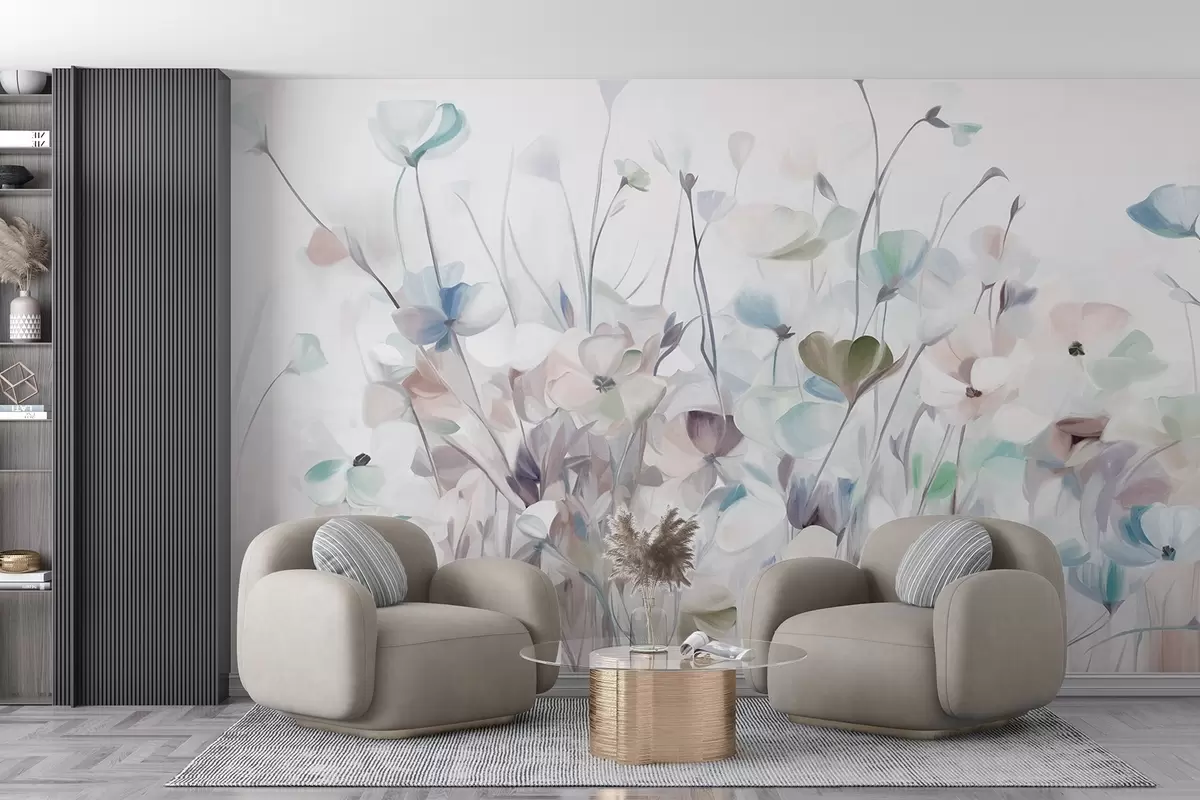Fotobehang Abstract veld met blauwe en bruine bloemen met lange stelen en bladeren, gestructureerd, pastelkleuren, gedempte kleuren N° w09466v1