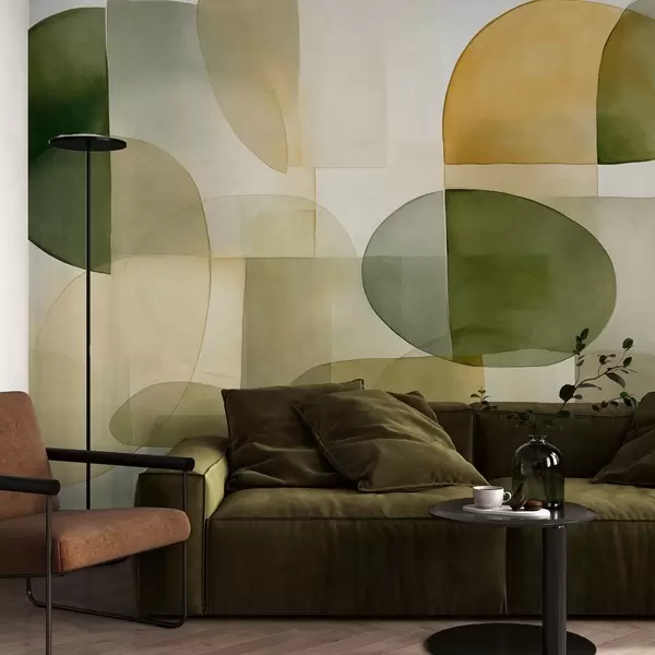 Fotobehang Abstracte vormen met textuur in groene en gele tinten, gedempte kleuren, minimalistische compositie, neutrale achtergrond N° w09467