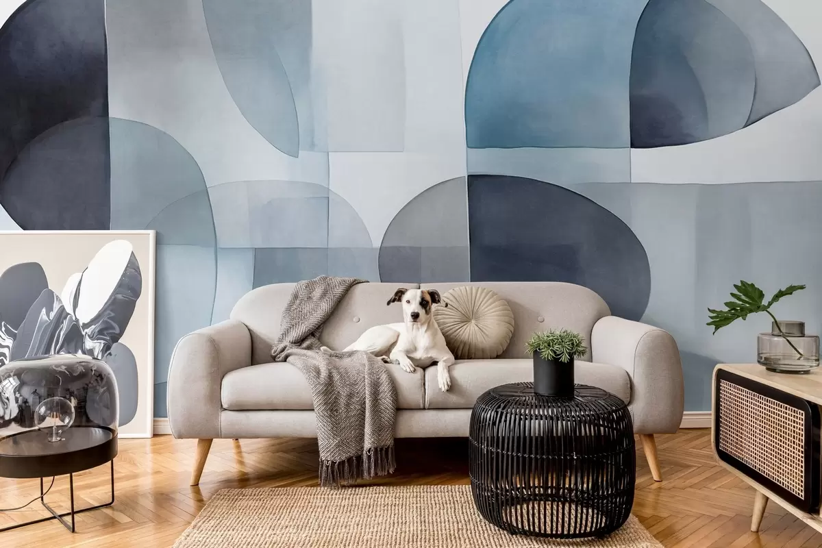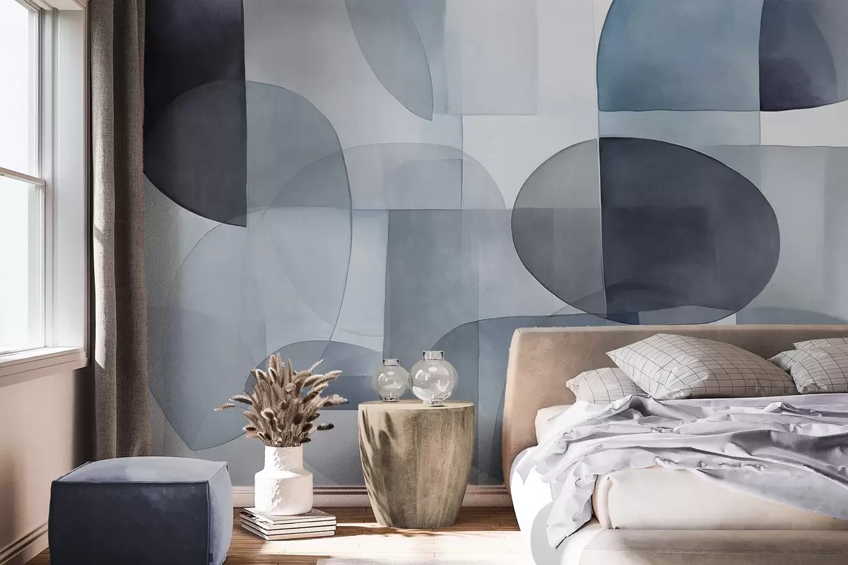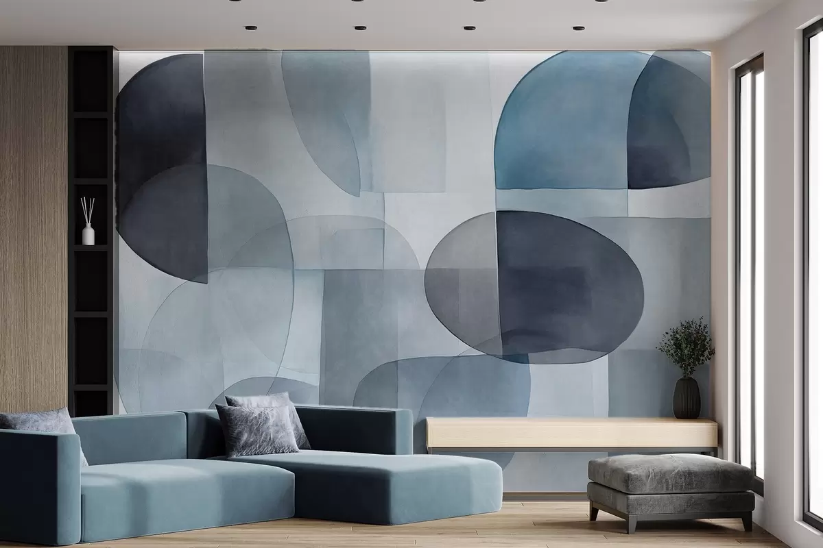 Fotobehang Abstracte vormen met textuur in grijstinten en blauwtinten, gedempte kleuren, minimalistische compositie, neutrale achtergrond N° w09467v1