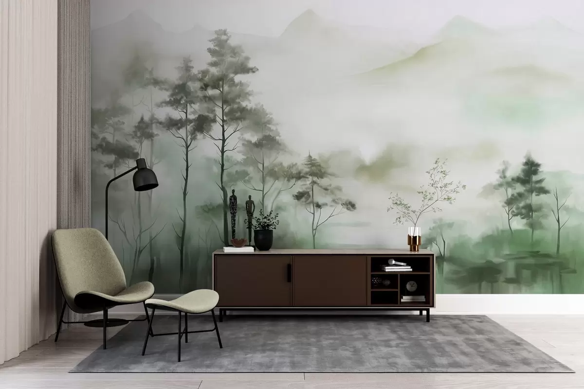 Fotobehang Mistig landschap met hoge bomen en bergen in gedempte groene en grijze tinten, minimalistische stijl, met textuur N° w09469