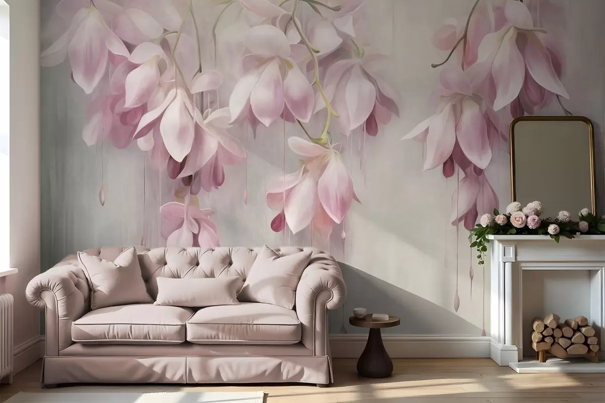 Fotobehang Hangende roze bloemen, lichtgrijze achtergrond, bloemenpatroon, botanische kunst, pastelkleuren N° w09471
