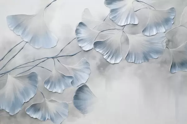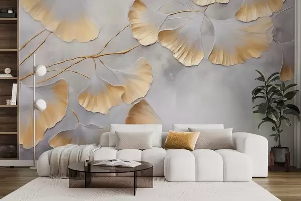 Fotobehang Ginkgo biloba-bladeren met gele randen op een tak, grijze gestructureerde achtergrond, elegant en minimalistisch ontwerp N° w09472