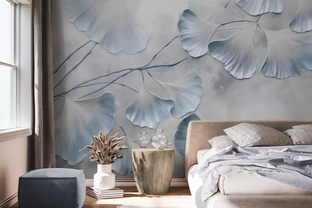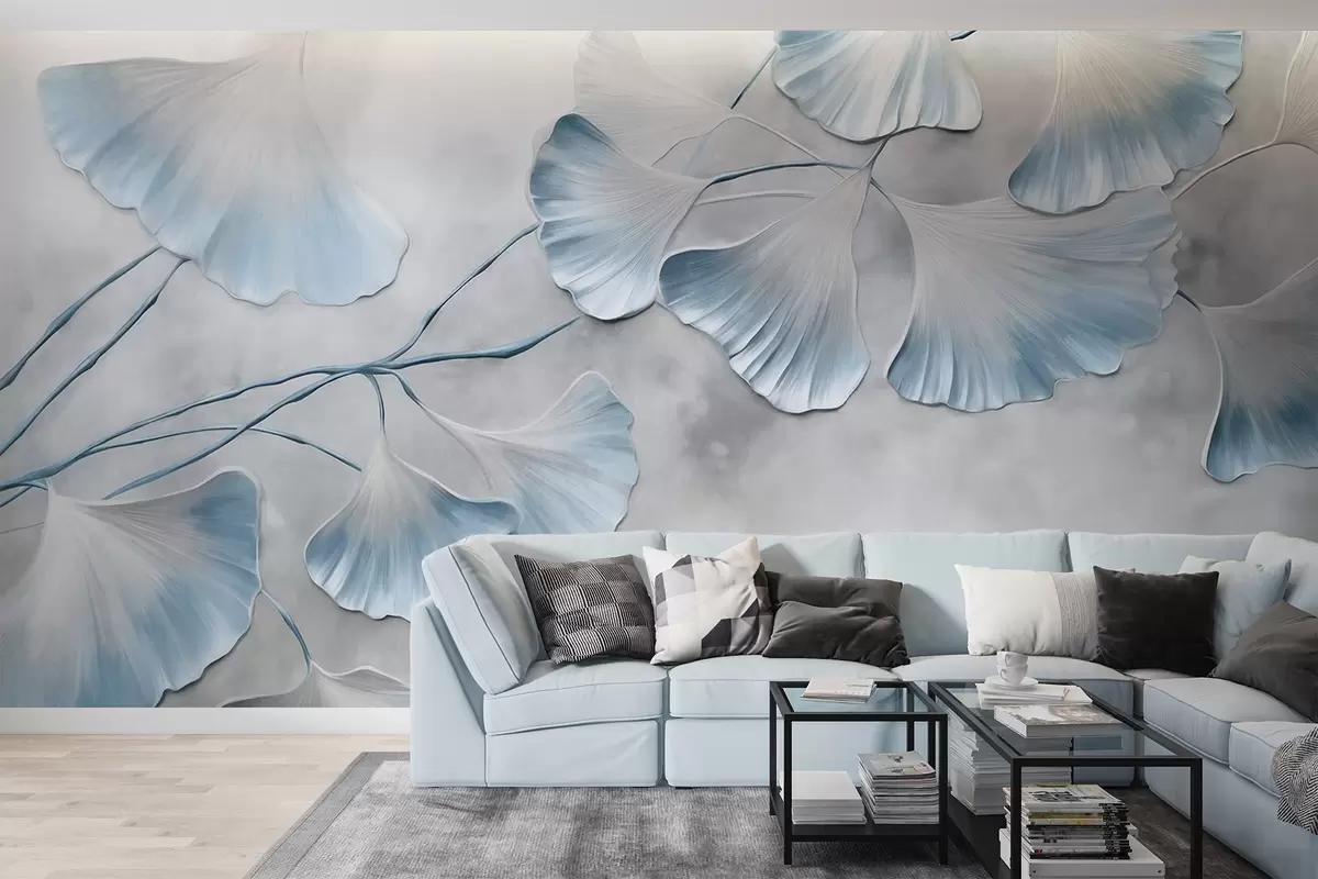 Fotobehang Ginkgo biloba-bladeren met blauwe randen op een tak, grijze gestructureerde achtergrond, elegant en minimalistisch ontwerp N° w09472v1