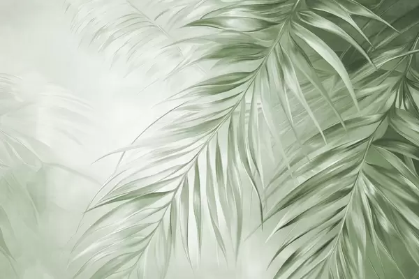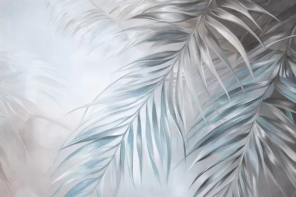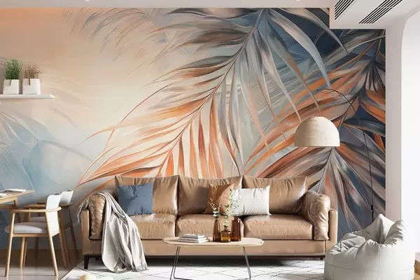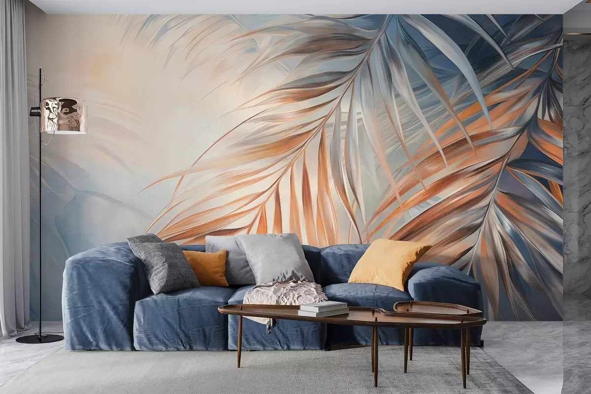 Fotobehang Palmbladeren met oranje en blauwe tinten, lichte gestructureerde achtergrond met zachte kleuren, elegante tropische stijl N° w09475