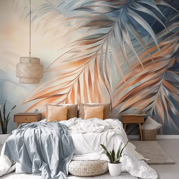 Fotobehang Palmbladeren met oranje en blauwe tinten, lichte gestructureerde achtergrond met zachte kleuren, elegante tropische stijl N° w09475