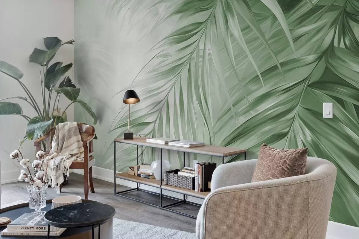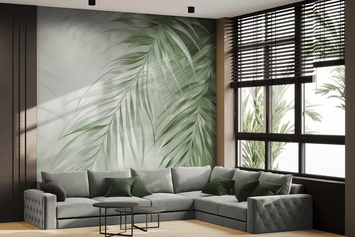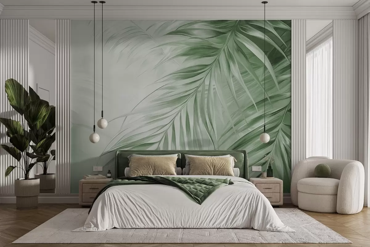 Fotobehang Palmbladeren met groene tinten, lichte gestructureerde achtergrond met zachte kleuren, elegante tropische stijl N° w09475v2