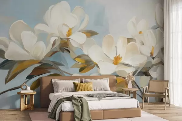Fotobehang Witte magnolia's met groene bladeren op een lichtblauwe achtergrond met abstracte penseelstreken imitatie N° w09478