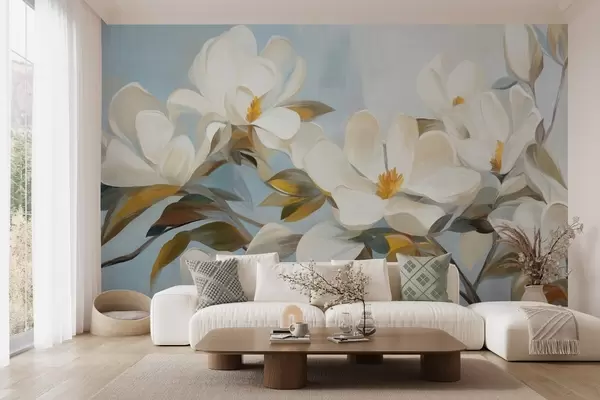 Fotobehang Witte magnolia's met groene bladeren op een lichtblauwe achtergrond met abstracte penseelstreken imitatie N° w09478