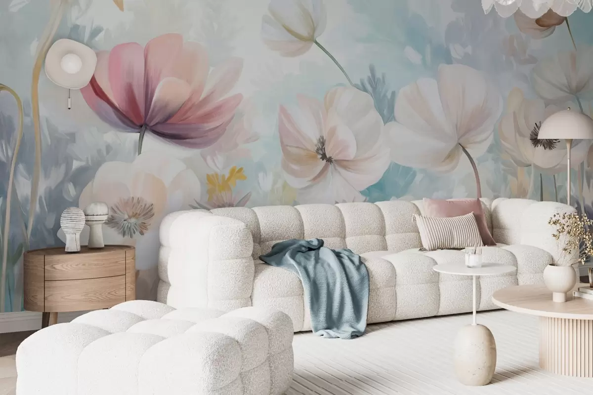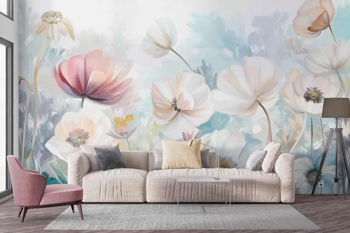 Fotobehang Een veld met pastelkleurige bloemen met delicate bloemblaadjes en zachtgroene bladeren, in een dromerige, gestructureerde aquarelstijl N° w09481