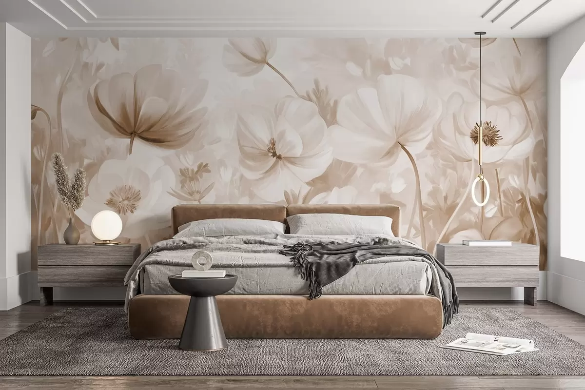 Fotobehang Een veld met beige bloemen met delicate bloemblaadjes, zachte bruine bladeren, in een dromerige, gestructureerde aquarelstijl N° w09481v1
