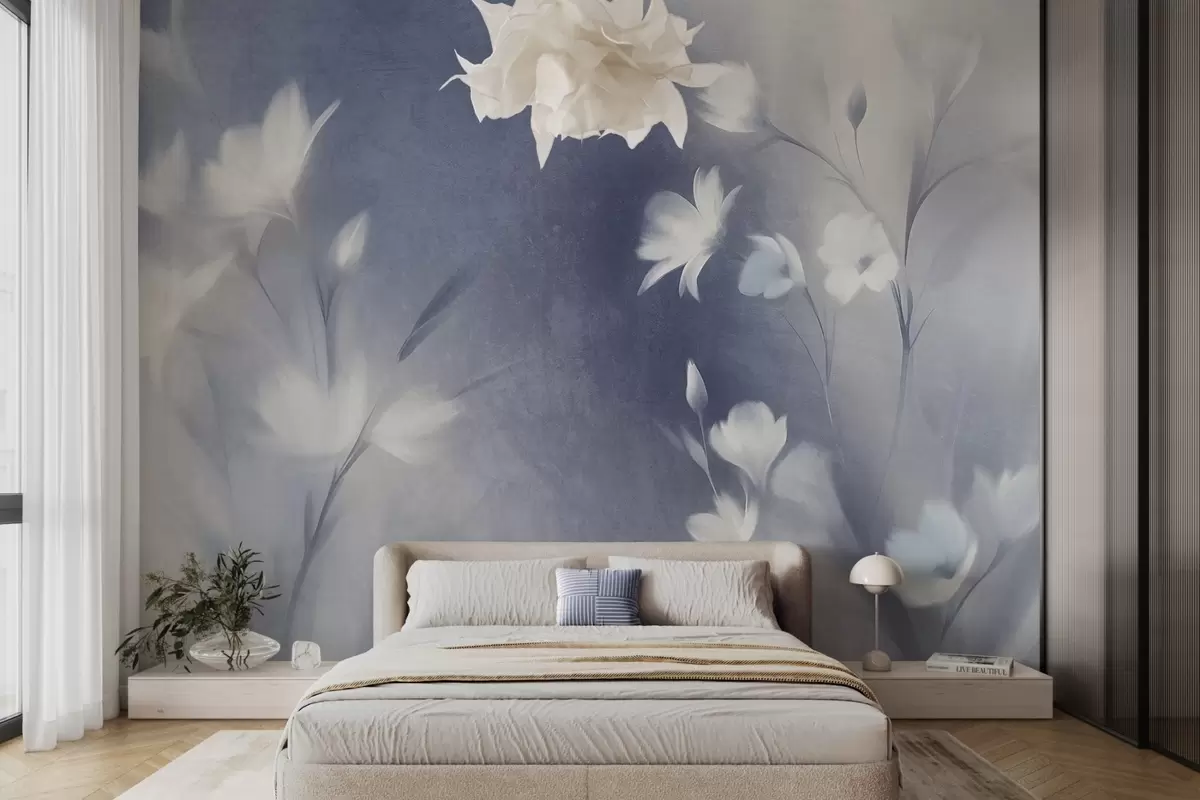 Fotobehang Witte bloemen met textuur en lange stelen, zachte knoppen tegen een wazige achtergrond van blauwe en witte tinten N° w09484