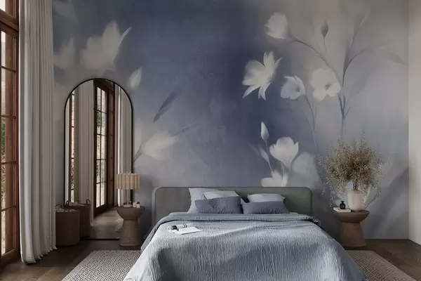 Fotobehang Witte bloemen met textuur en lange stelen, zachte knoppen tegen een wazige achtergrond van blauwe en witte tinten N° w09484