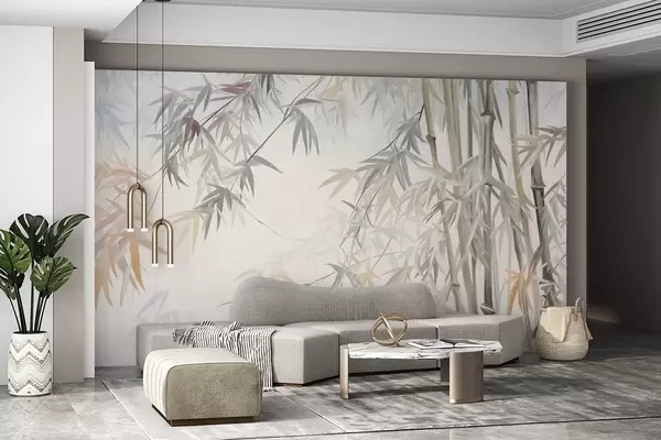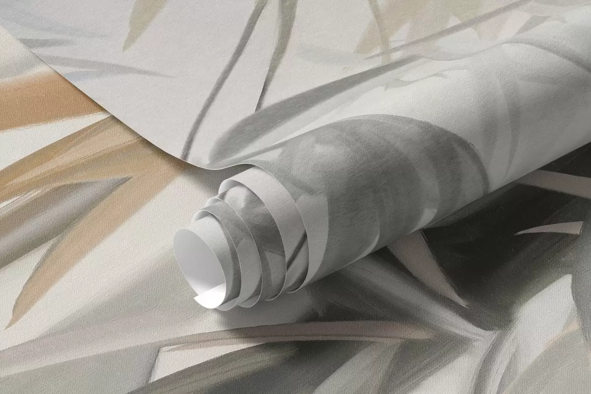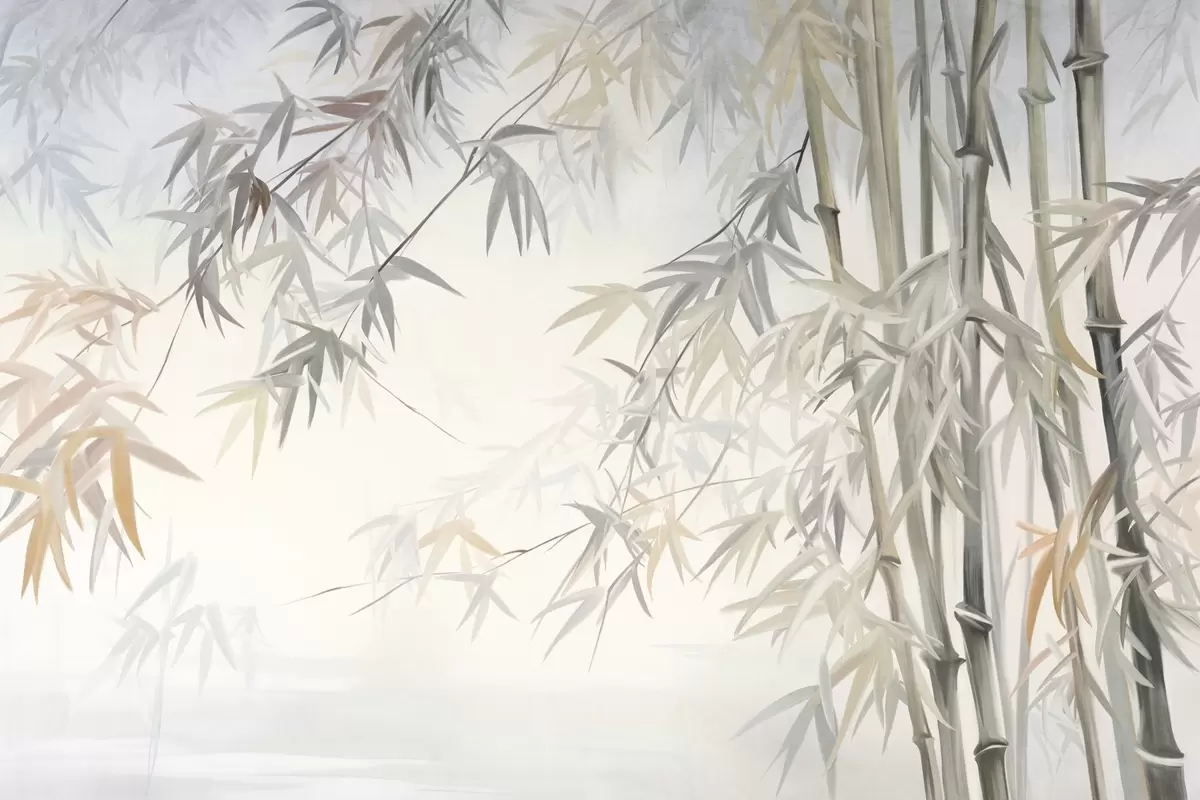 Fotobehang Getextureerde bamboestengels en bladeren in een zacht, ingetogen kleurenpalet van grijs, wit en crème, minimalistische compositie N° w09485