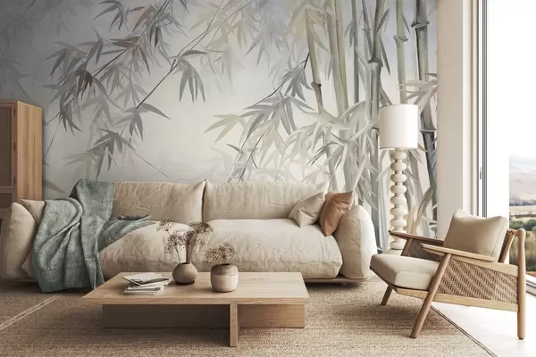 Fotobehang Getextureerde bamboestengels en bladeren in een zacht, ingetogen kleurenpalet van grijs, wit en crème, minimalistische compositie N° w09485
